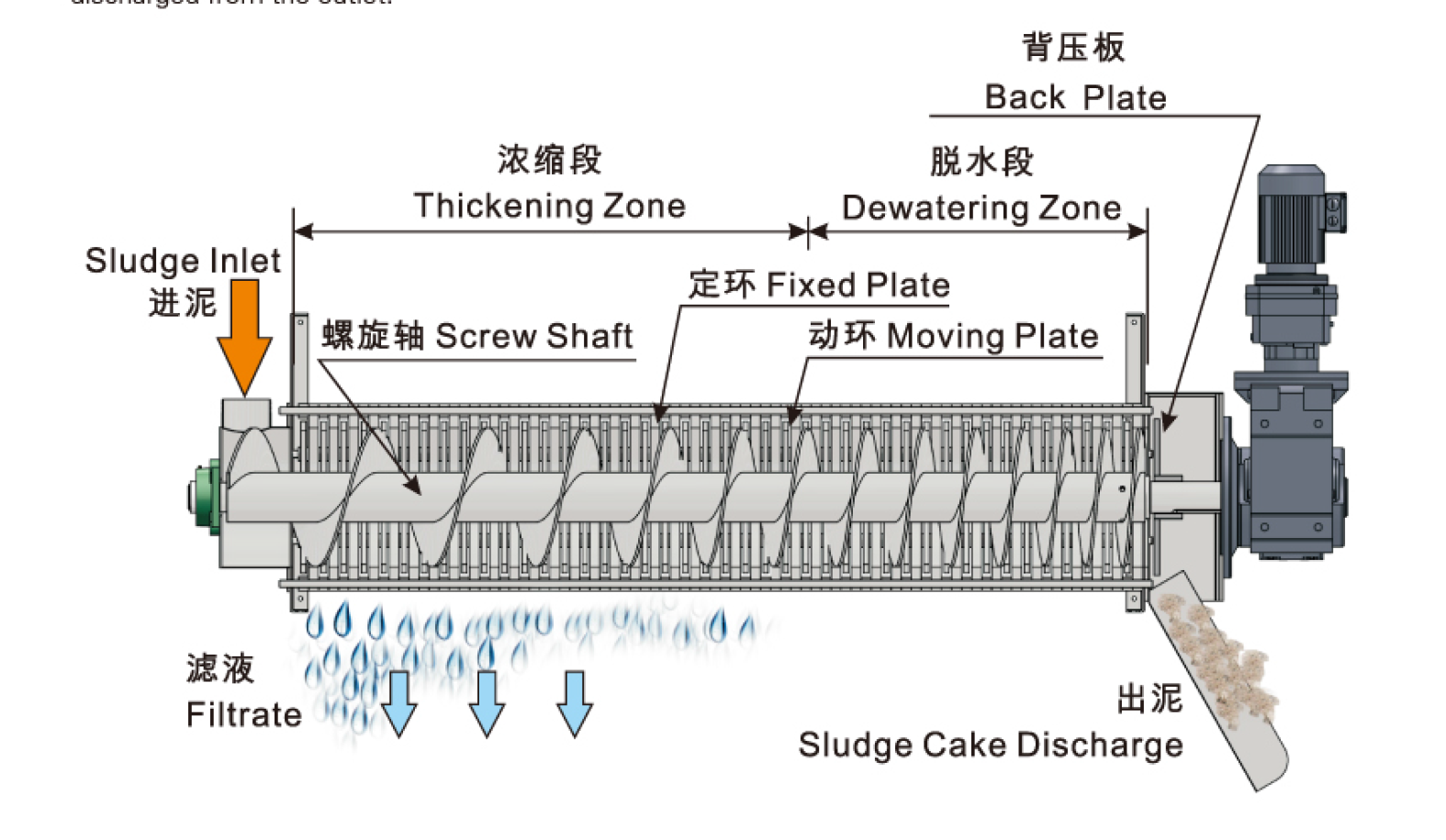 主體是由多重固定環(huán)和游動(dòng)環(huán)構(gòu)成,螺旋軸貫穿其中形成的過濾裝置。前段為濃縮部,后段為脫水部,將污泥的濃縮和壓榨脫水工作在一筒內(nèi)完成, 以獨(dú)特微妙的濾體模式取代了傳統(tǒng)的濾布和離心的過濾方式。污泥在濃縮部經(jīng)過重力濃縮后,被運(yùn)輸?shù)矫撍?/span>,在前進(jìn)的過程中隨著濾縫及螺距的逐漸變小,以及背壓板的阻擋作用下產(chǎn)生極大的內(nèi)壓,容積不斷縮小,達(dá)到充分脫水的目的。